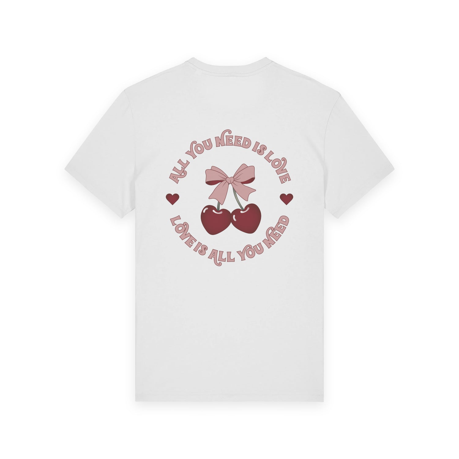 Smukkeste kærlighedsmotiv med kirsebær, sløjfer og hjerter. Let T'shirt i blød kvalitet, lavet af 100% organisk bomuld.
