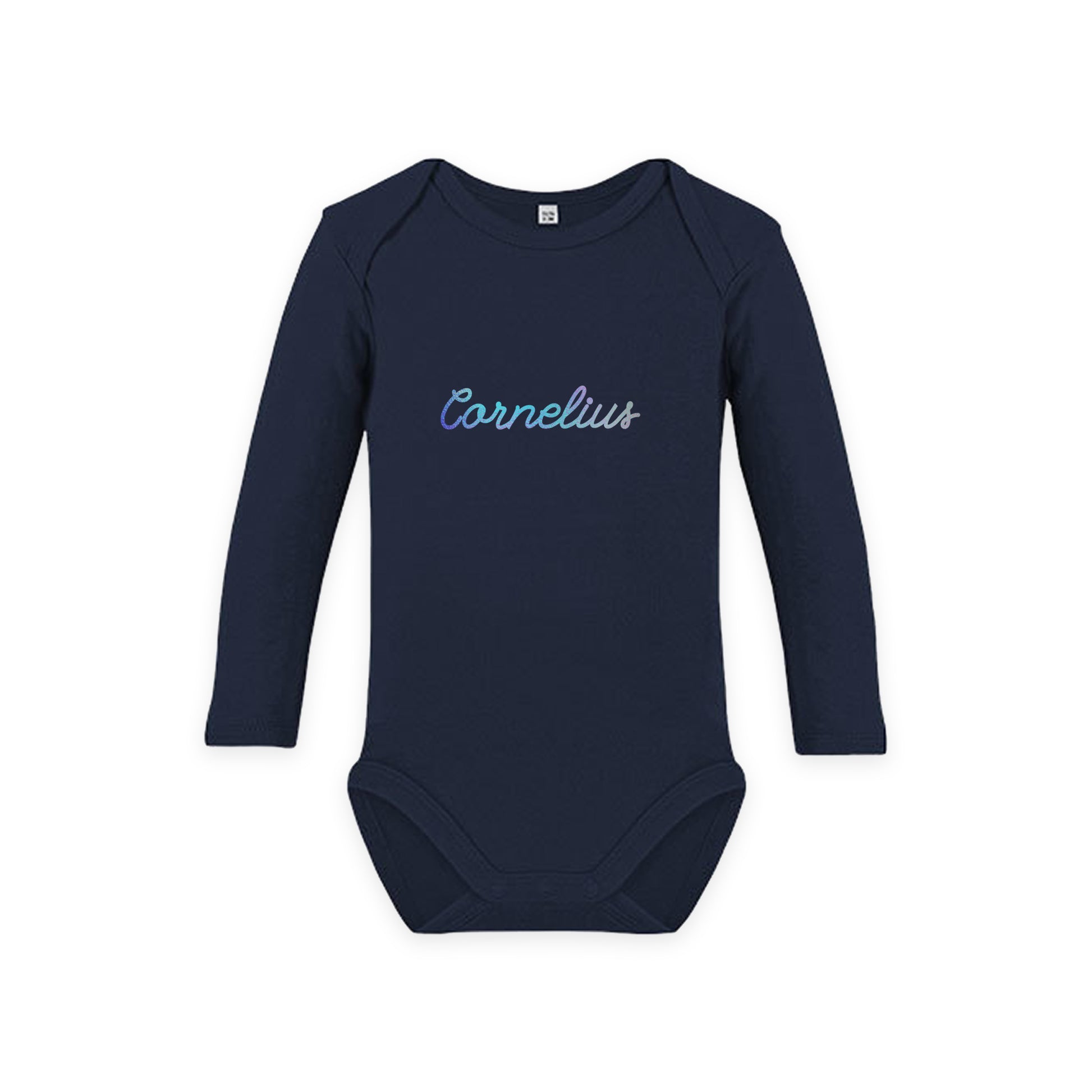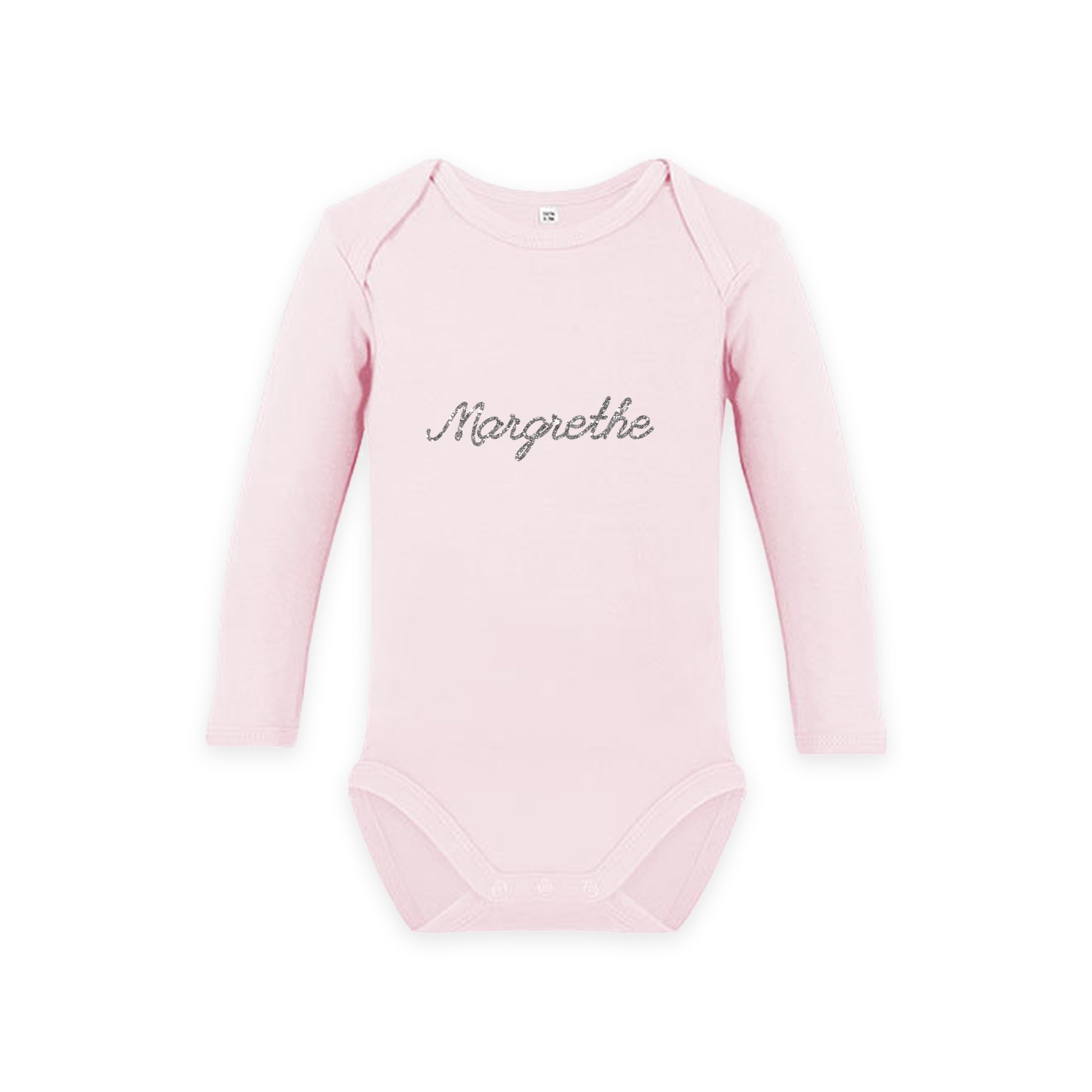 Magisk body med personligt navn. Navnet kan designes med 2 typer folie (stjerneskær eller regnbue effekt), som din baby uden tvivl vil elske. Produktionstiden vil være ca. 1 uge.