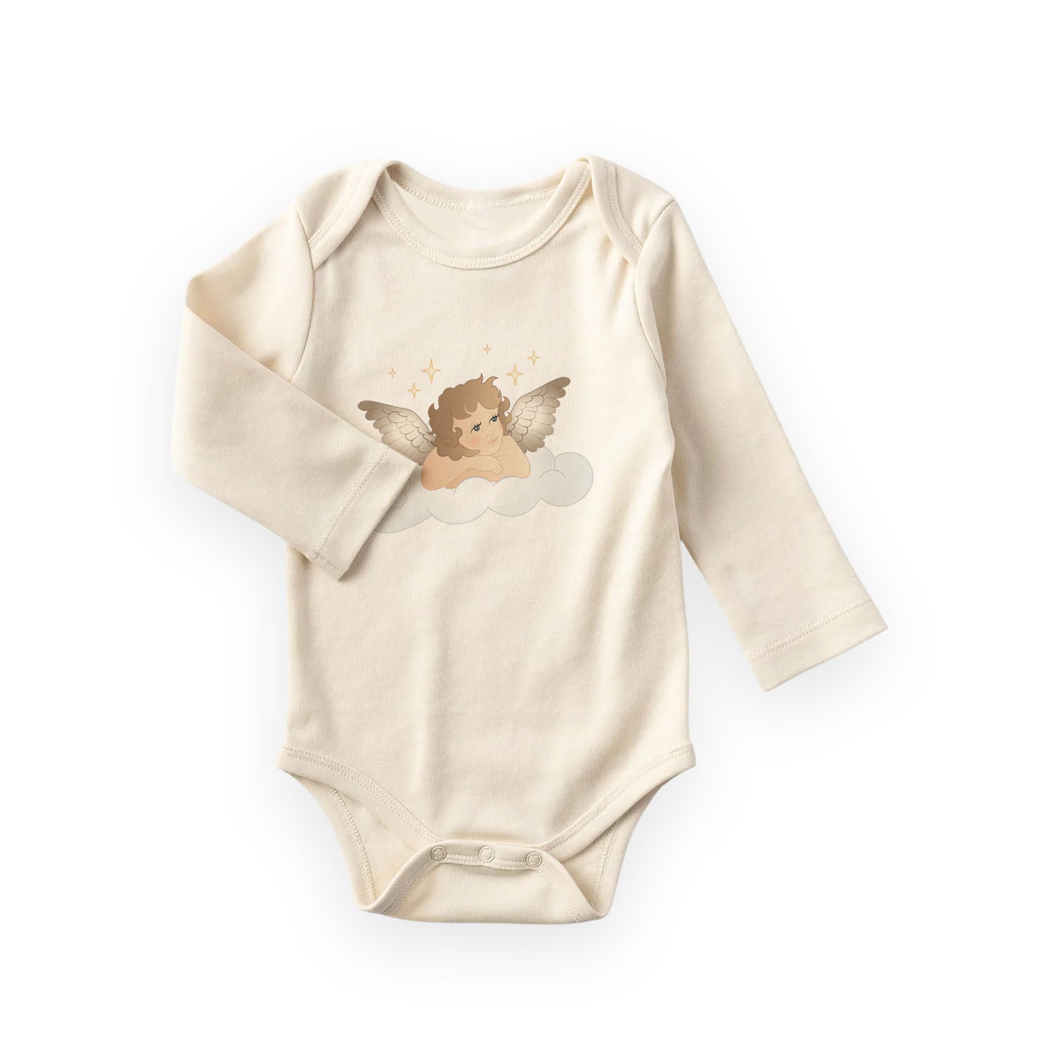 Sødt englemotiv på blød babybody i 100% økologisk bomuld. Nikkelfri trykknapper.