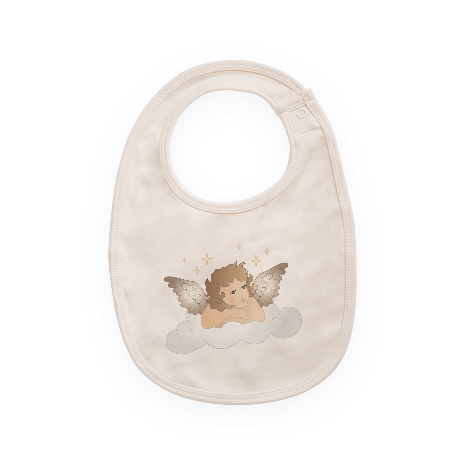 Hagesmæk i kæmmet bomuld med smukt englemotiv. Nikkelfri trykknap.