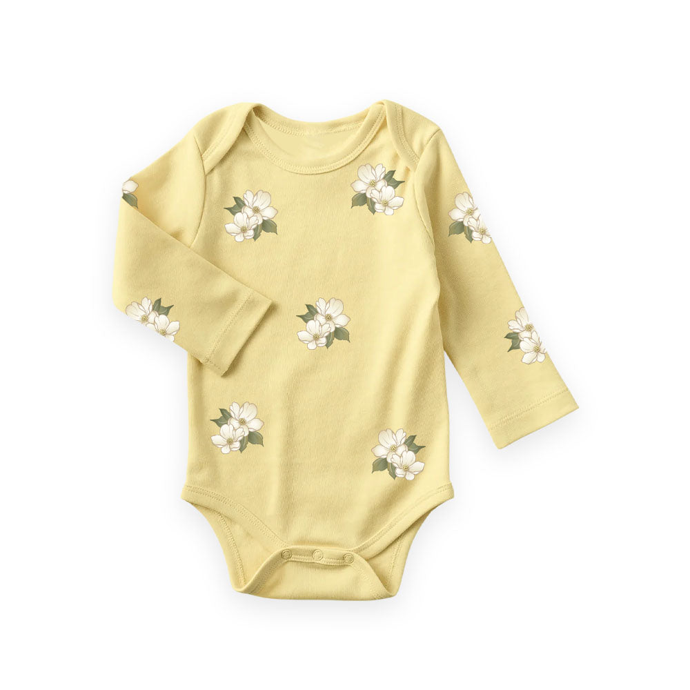 Smuk lysegul body med smukke hvide blomster. 100% økologisk bomuld.